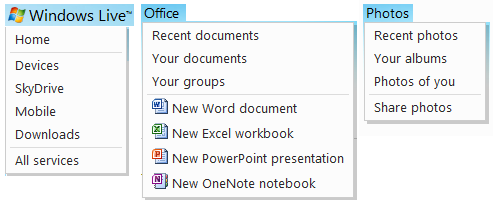 Each of the commands also provides a drop-down menu to select the specific item or task desired. Clicking on the “Windows Live” title also presents a menu. The menus are shown here.
