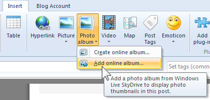 Windows Live Writer has an insert option for adding a SkyDrive album to a post. When Add online album is selected, an “Insert Photo Album” dialog opens. It may ask for a sign in before showing all the albums on your SkyDrive. Click an album icon and then