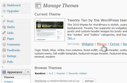 To check if your theme supports custom menus, expand the Appearance tab in the navigation pane on the left of your Dashboard. Click Themes. Your current theme will be shown on the top of the page. The illustration below shows the default theme, “Twenty Ten”.