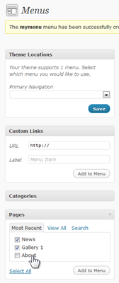 If you do not yet have a custom menu, there is just one thing to do on the Menus page, that is to create a menu. Enter a name for the menu in the box (“mymenu” will do) and click Create Menu. image