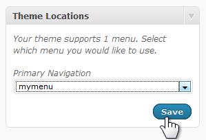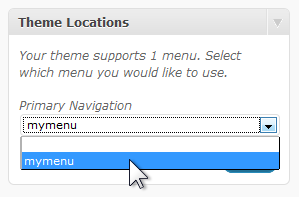 The last step to install the custom menu is under Theme Locations. The selector under Primary Navigation shows the default, blank area and the menu you created.