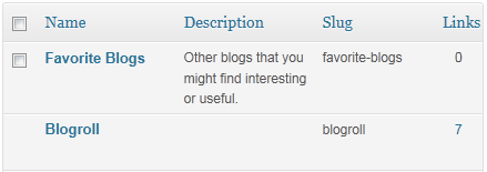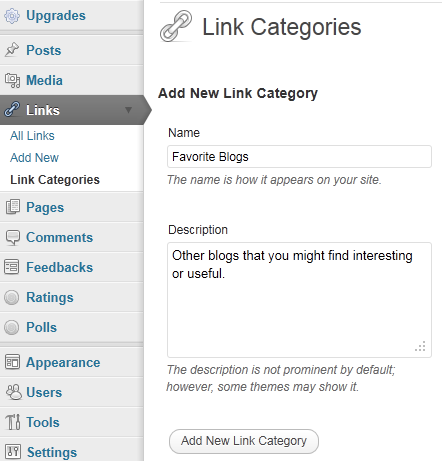On the WordPress Dashboard, in the navigation pane on the left, find Links. If it is not expanded click it so the tabs “All Links”, “Add New”, and “Link Categories” show. Click Link Categories to display the Link Categories page. image