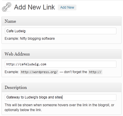 imageClick the Add New tab to bring up the Add New Link page. Fill in the spaces with the name of the blog or site, the full URL, that includes the “http://” part, and some description of the link.