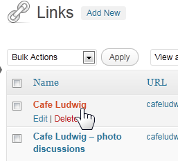 Your blog already has a number of links in a category called “Blogroll” that were set up along with your blog. You can modify this group, but it is easier to add a new “Link Category”. You need to add the links you want, and finally you need to place the Links Widget into the sidebar. Lets take these up in order.