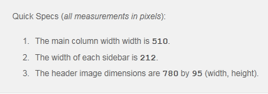 It will list the column width, the sidebar width and the header image size. Note the sidebar width. I suggest you make your images about 10 pixels narrower than the sidebar so that they will fit nicely. For this blog, the sidebar width is 212 pixels, I make my images 200 pixels wide. The height is not so important, but the Links list looks best with strip images so it does not get to be too long.