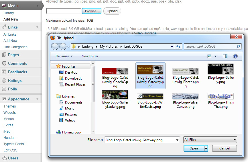 Click Browse. In the File Upload dialog locate the folder with your link logo images. Click on one of them. Click Open. Then click Upload in the Upload New Media page.