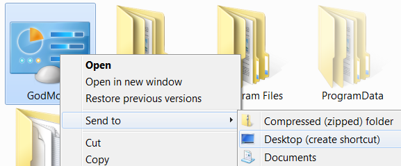 Right-click the GodMode folder, move the pointer down to Send to, then to the right and click Desktop (create shortcut).