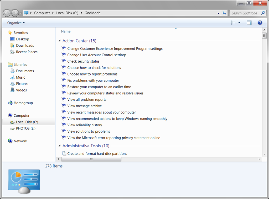 “God Mode” is a cute name for an otherwise mundane search listing of the various options in Control Panel. Having all the features displayed in imageWindows Explorer eliminates searching through the menus and offers a real convenience. The different ways of showing the results in Windows Explorer are another benefit of “God Mode”. This tool is actually very simple and does not take up much space.