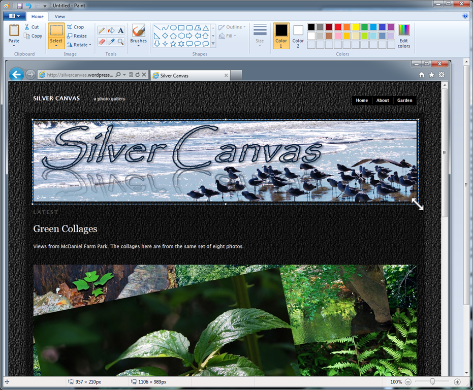 Click Select and drag a frame around the header image or header area of the page. Click Crop. The header image is now the only thing in Paint.