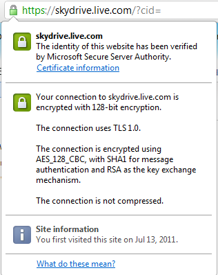 The “s” in “https” stands for “secure” (“HyperText Transfer Protocol Secure”). This used to show up mainly when shopping or banking online, where you normally signed in to your account. Many other sites use “https” to provide a secure communications link between the site and the user’s browser. In particular Windows Live SkyDrive uses https full-time, even if you are not signed in or are viewing a friends SkyDrive albums.