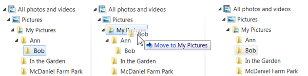 To move it so it is on par with – at the same level as – folder Ann, proceed as follows: Drag the folder to the name of the folder where you want it. In this illustration we want folder Bob to be inside My Pictures. So it is dragged to the My Pictures folder name. Notice the little note (screen tip) that says “Move to My Pictures”. When it says the correct folder name, drop it (let go the mouse button). You have moved the folder.