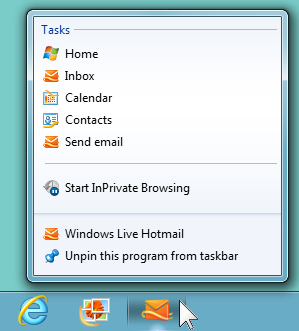 When the icon on the taskbar is imageclicked it also takes you to your Windows Live home page. Right-click the taskbar icon and the jump list shows the options Home, Inbox, Calendar, Contacts, Send email. This makes getting to those services really easy.