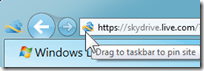 imageUsing Internet Explorer 9 sign in to your Hotmail account. Move the pointer to the small icon in front of the web address in the address field. Note the little message balloon that says: “Drag to taskbar to pin site”.