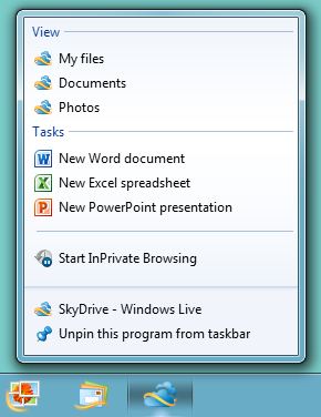 If you have elected to “Keep me signed in” the last time you signed in to Windows Live, Internet Explorer will launch and go right to your SkyDrive when the taskbar logo is clicked.