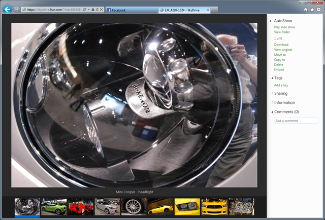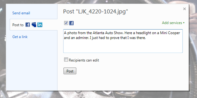 SkyDrive provides for very detailed sharing. You can share albums, or individual photos in a variety of ways including sharing on Facebook. In this article I will describe the steps for sharing on Facebook.