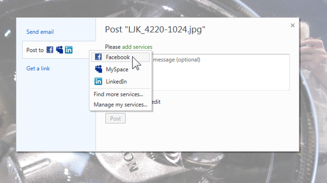Facebook before, click add service, then click on Facebook in the new menu. You will be taken through a number of dialogs to complete the connection to Facebook. Once that is complete, you can share to Facebook from the initial sharing dialog. When you click the Facebook icon in the Post to area, a checkbox with the Facebook icon is displayed. Click the checkbox. You can fill in the text of the message that is to appear with your Facebook post.![]()