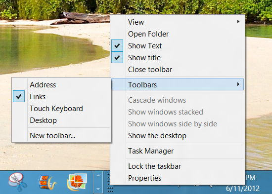 You can edit the names, you can rearrange the order by just dragging the listings up or down. You can, of course, also change the size of the taskbar and the toolbars that are on it. With the taskbar not locked, you can drag the taskbar top edge to change the height, you can drag the dimples at the end of the toolbars to resize them. Here is a view of part of my taskbar so rearranged.