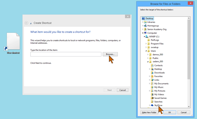 • On the primary user’s desktop right-click on an empty spot; click New, then click Shortcut.