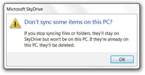 If you stop syncing files or folders, they’ll stay on SkyDrive but won’t be on this PC. If they’re already on this PC, they’ll be deleted.SkyDrive-sync-12