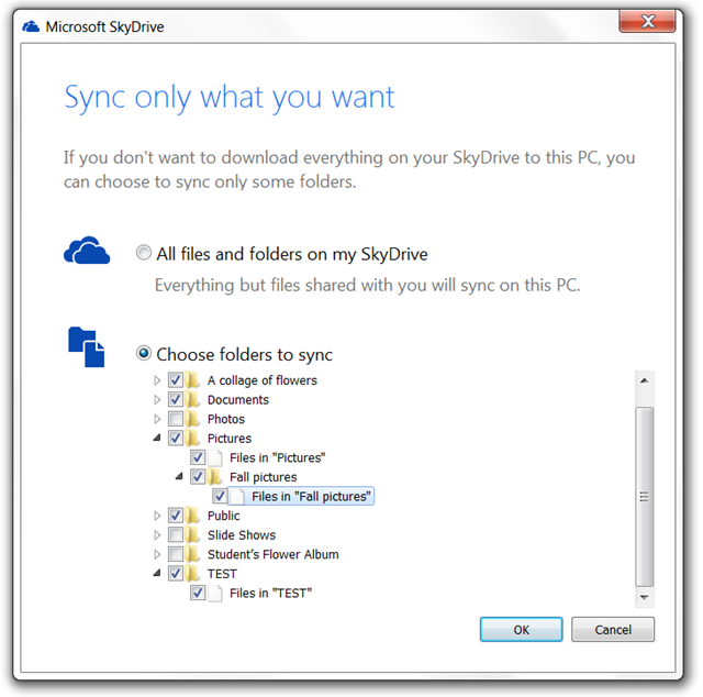 The SkyDrive desktop app by default syncs, that is, copies to the computer, all folders in SkyDrive. If you do not wish to replicate all folders, you can choose which to sync. Here is how: