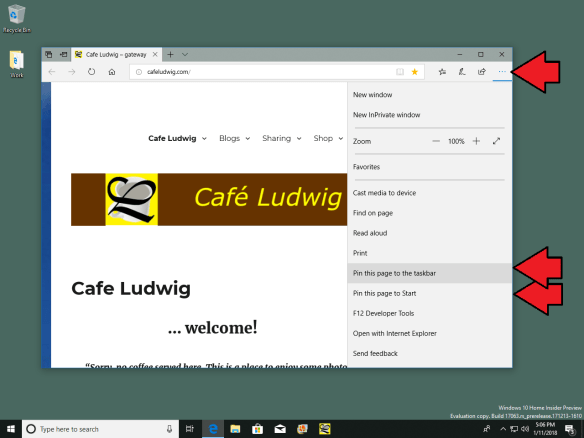 With the website loaded in your browser, click the three-dot icon at the top right. The drop-down menu provides two options: Pin this page to the taskbar and Pin this page to Start. Click whichever you like. Of course, you can set both. You will see the website icon on the Taskbar and/or in Start when you click the Windows icon or Start.