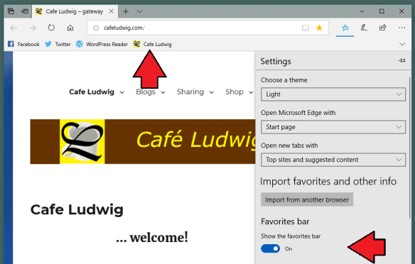 In the Settings dialog look down just a bit and you will find Favorites Bar – Show the favorites bar and a slider control. Set the slider to the right – ON. Your Favorites Bar will be shown with your tabs.