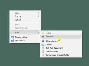 Then right-click on an empty spot on your desktop. Click on New and then in the next drop-down menu, click Shortcut.