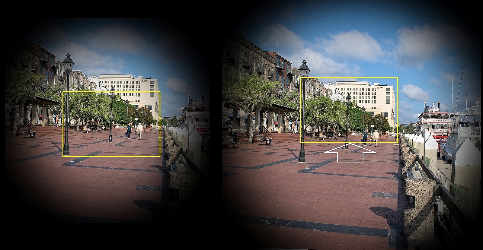 The left image models the view with a regular camera lens. The yellow frame simulates the sensor size and shows what the result would be. Note that the building is only partially included.