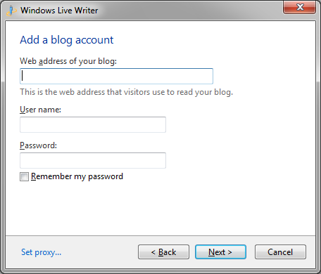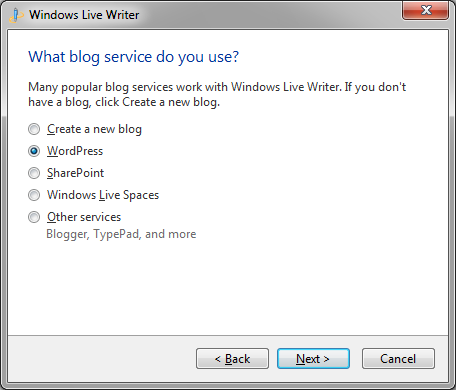 Note: If you want to configure an additional blog or skipped the initial configuring, click File (the button in upper left), then Options, then Accounts. There is an Add button, click that and it takes you to the “What blog service…” dialog as illustrated above.