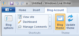 Windows Live Writer Ribbon. Click that and you have access to your blog and your blog account. Click Dashboard and your browser opens and takes you right to your WordPress dashboard (you may have to sign in, set the “remember me” options to get right in on future visits).