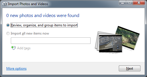 On occasion you will get a dialog that says “0 new photos and videos were found” when you try to import pictures from your camera.Import-01 This happens if you already have imported those photos, even though you might have deleted or moved the pictures on the computer.