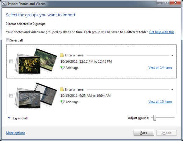 Photos will be grouped by date. You can change the grouping with the slider control on the bottom. You can enter a names for the folders that will be created for each group. You can also specify tags that will be common to all the photos in a group. This can really help you get your organizing of the photos underway. Click on “Enter a name” to enter the folder name (or the name part of the folder name). Click on Add tags to get this started.