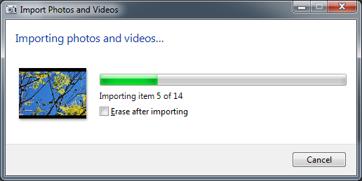 Import-04While the photos are being imported you will see the progress in a dialog like the one shown here. Note the check box with the legend “Erase after importing”. This means “erase from the camera after the photos have been imported to the computer”. I always leave that unchecked, which is also the default. This way the photos stay on the camera.
