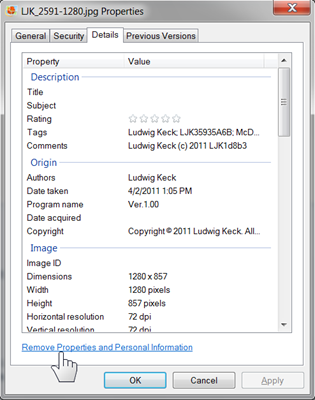 When you right-click an image file a small menu window pops up. The last option is “Properties”. Clicking that choice brings up a small window something like this example shown on the left: