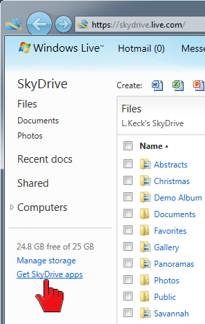 imageIf you do not have the SkyDrive app, sign in to your Microsoft account, click  SkyDrive in the top menu bar. In the navigation pane on the left click “Get SkyDrive apps” at the bottom of the listings. Step through the download and installation process.
